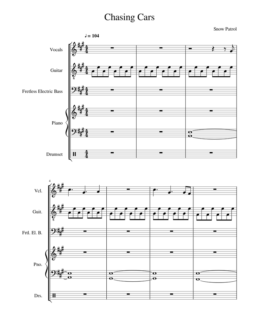Chasing Cars Sheet Music For Piano Guitar Bass Guitar Drum Group Mixed Quintet Musescore Com